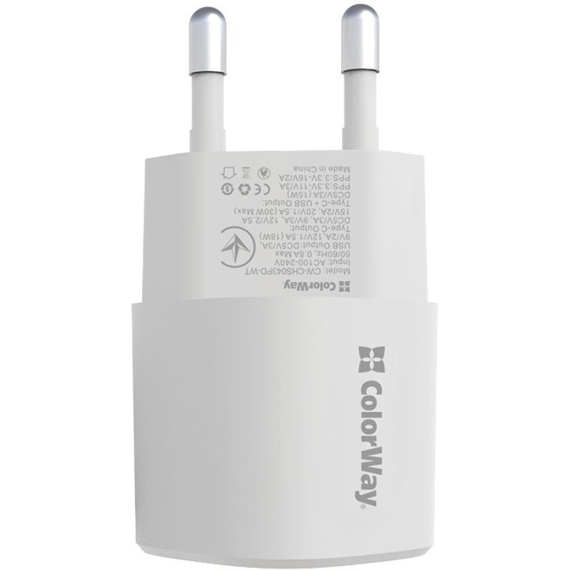 Мережевий зарядний пристрій Colorway Power Delivery Port PPS (Type-C PD + USB QC3.0) (33W) - це потужний адаптер, оснащений двома портами USB і PD, що дозволить одночасно заряджати 2 пристрої.