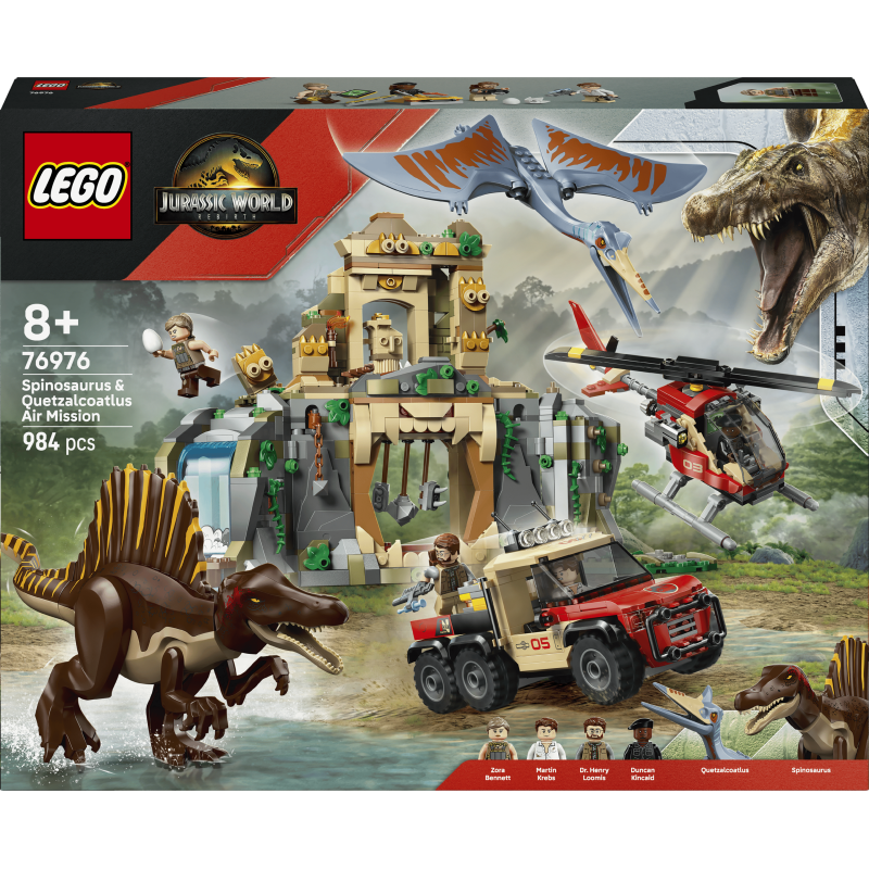 У цьому інтерактивному наборі LEGO Jurassic World Спінозавр та Кетцалькоатль: Повітряна місія (76976) дітей та фанатів фільму віком від восьми років чекають на незвичайні пригоди. Натхненний фільмом, набір включає дві формовані фігурки динозаврів та чотири персонажі з фільму "Світ Юрського періоду: Відродження": Мартіна Кребса, Зору Беннетт, Дункана Кінкейда та доктора Генрі Луміса. У спинозавра рухливі ноги, лапи, хвіст, голова і паща, а у кетцалькоатля — рухливі крила та паща. Крім того, набір включає стародавній храм з водоспадом, пастку з сокирами, що падають, перекидаються колони, гніздо і яйця. Тут також є іграшковий вертоліт, вантажівка, контейнер для шприців, три шприци та багато іншого.