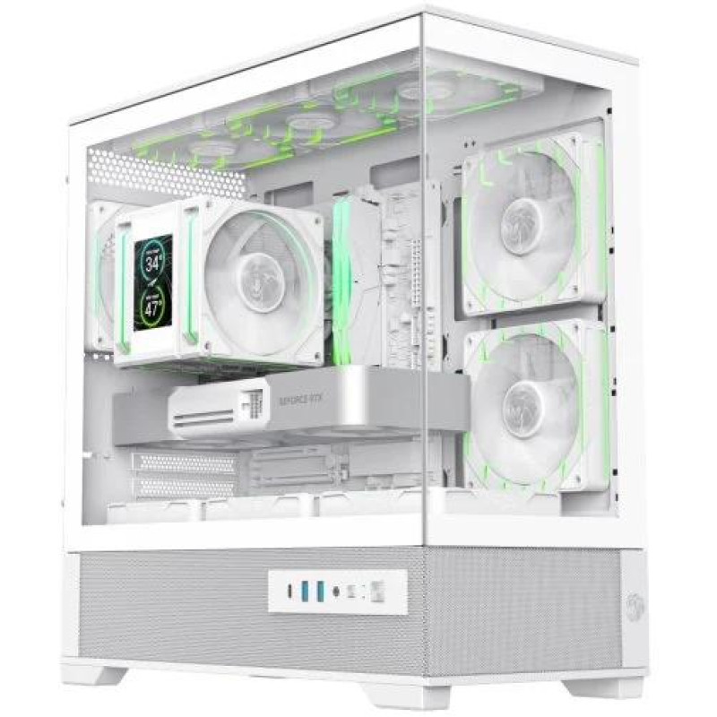 Корпус вже комплектується трьома ARGB PWM-вентиляторами, які забезпечують ефективне охолодження та створюють привабливе RGB-підсвічування. У комплекті йде сучасний контролер V5.0 PWM ARGB HUB, що підтримує до 6 вентиляторів та 6 світлодіодних стрічок, а також зручний пульт дистанційного керування. Завдяки підтримці повітряного і рідинного охолодження (у тому числі радіаторів до 360 мм зверху), VISTA 2 легко адаптується до потужних систем.