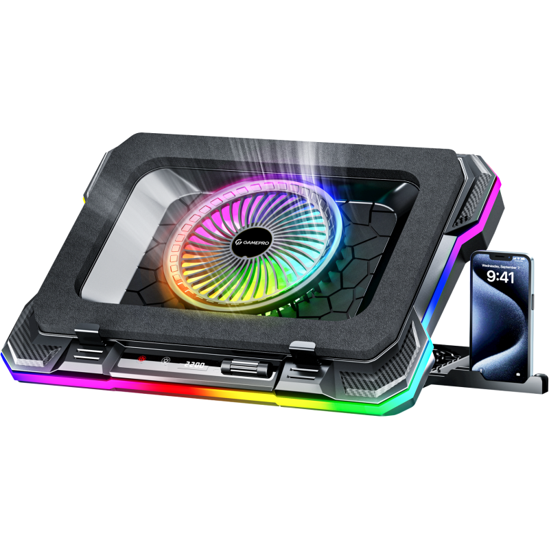 GamePro CP950 - это инновационное решение для активного охлаждения ноутбука, сочетающее в себе высокую производительность, передовые технологии и яркий дизайн. Благодаря сверхмощному вентилятору диаметром 140 мм, она обеспечивает необходимый поток воздуха для эффективного снижения температуры ноутбука, даже во время интенсивных нагрузок. Вентилятор поддерживает широкий диапазон плавной регулировки скорости вращения - от 300 до 2200 об/мин, что позволяет настроить уровень охлаждения в соответствии с задачами - от ежедневного пользования до игровых сессий или сложных вычислений. Также, сам вентилятор имеет двойную систему защиты от прохождения пыли, что существенно повышает эффективность и дополнительно защищает ваш ноутбук. Одно из ключевых преимуществ - уплотняющая пористая прокладка с магнитным креплением, которая обеспечивает максимально эффективную подачу воздуха к ноутбуку со значительно более низким коэффициентом потери полезного действия. Подставка имеет функцию регулировки угла наклона - всего доступно 8 уровней с углом наклона от 20° до 45°. Это обеспечивает удобство и адаптивность для использования дома, в офисе или во время гейминга. Регулируемая RGB-подсветка с возможностью изменения цветов добавляет яркости и акцентирует внимание на устройстве, позволяя пользователю персонализировать рабочее пространство. Устройство оборудовано LCD-дисплеем, который отображает текущую скорость вращения вентиляторов. Также подставка оснащена двумя USB Type-A портами, которые предназначены для подачи питания и подключения периферии. Дополнительный бонус - съемная подставка для смартфона, позволяющая удобно разместить телефон рядом с ноутбуком.