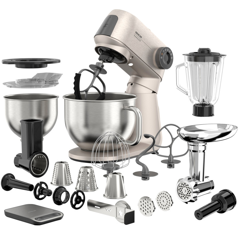Модель оснащена широким набором дополнительных насадок: мясорубкой для грубого и мелкого помола, блендером объемом 1.5 л со светодиодной подсветкой, насадкой для приготовления колбасок, приставкой для формовки печенья, а также шинковательно-терковым модулем с чехолом. Дополнительным преимуществом являются разумные весы с поддержкой SENCOR Food, что помогает точно контролировать ингредиенты и упрощает приготовление разнообразных блюд.