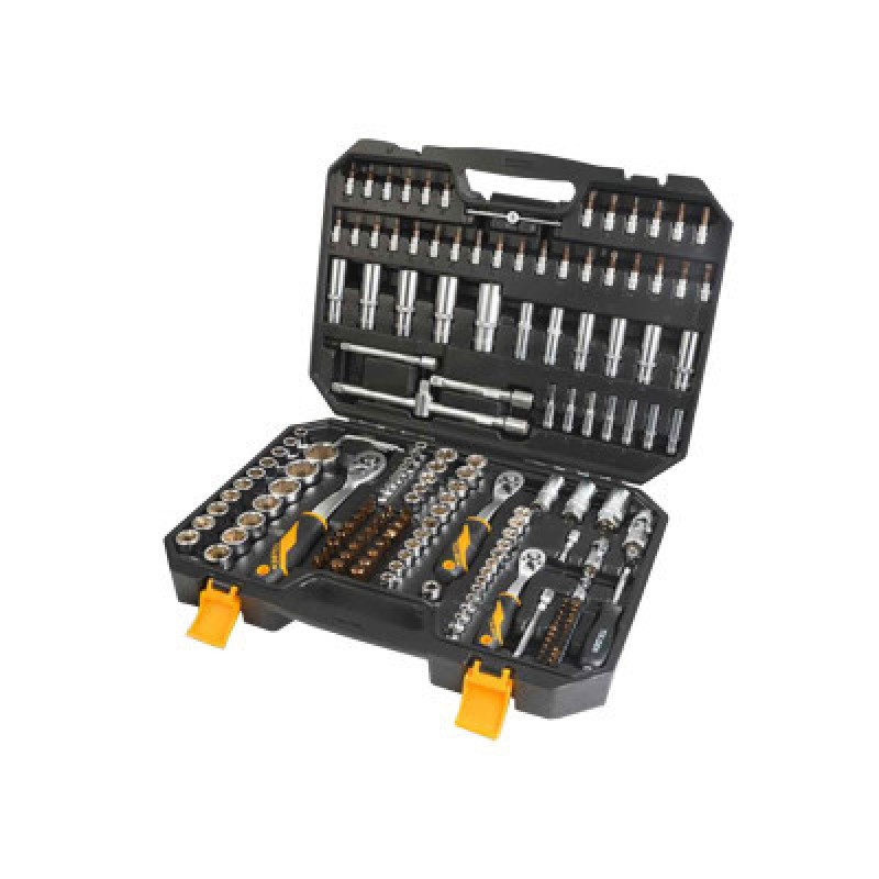 Комплектація:біти, комір з шарніром, комір, тримач для біт, інструменти для роботи з торцевими головками, кардан шарнірний, перехідник для головок, торцеві головки, тріскачка, подовжувач, шестигранні/зіркоподібні ключі