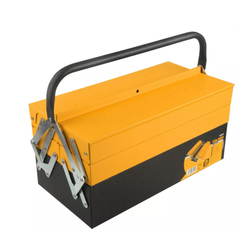 Металева розсувна інструментальна ящик 404×200×205 мм TOLSEN Ящик для інструментів Tolsen Profi (80211) призначений для зручного зберігання та перенесення дрібного інструменту, господарського інвентарю, рибальських снастей та багатьох інших корисних речей. Дуже зручно зберігати набір інструментів у автомобілі. З особливостей варто відзначити надійний металевий корпус, трирівневу розкладну систему та зручну ручку транспортування. сталь із порошковим покриттям, товщиною 0.8 мм; 3 рівні для розміщення інструменту; 2 пари розсувних секцій над основою; Металева трубчаста ручка на всю довжину ящика; Вага нетто: 3.3 кг